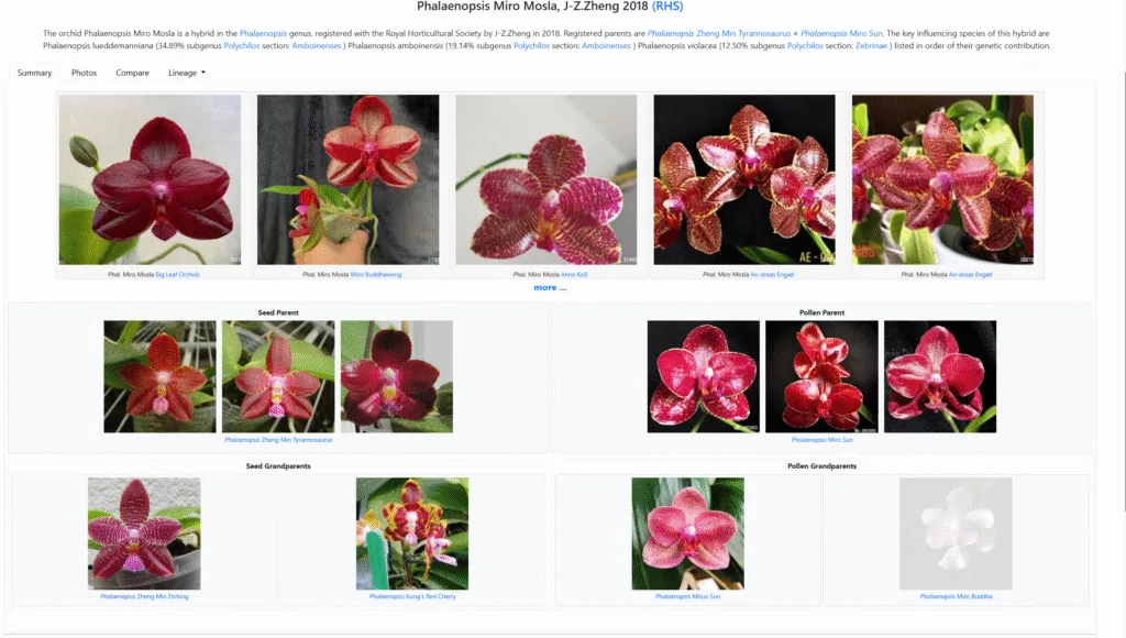 Za razliku od zvaničnog registra RHS, OrchidRoots je posebno vredan zbog velikog broja slika. Na ovaj način može se ne samo pročitati poreklo određenog hibrida, već i videti kako izgleda u kolekcijama širom sveta. Korisni odeljci poput „Lineage“ (rodoslov), „Images“ (fotografije) i „Compare“ (upoređivanje hibrida) omogućavaju dublje proučavanje istorije biljke i njenih karakteristika.